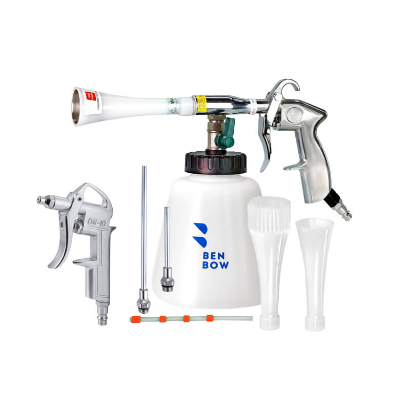 Drugim elementem zestawu jest pistolet do przedmuchu BenBow DG-10 o solidnej, stalowej konstrukcji. Jest on idealny do usuwania kurzu, suszenia lakieru oraz przedmuchiwania trudno dostępnych miejsc, np. wokół reflektorów. W zestawie znajdują się dwie wymienne dysze (8 cm i 14 cm), co zwiększa jego wszechstronność. Oba narzędzia są łatwe w obsłudze dzięki ergonomicznym uchwytom i szybkiemu podłączeniu do źródła sprężonego powietrza (gwint 1/4").