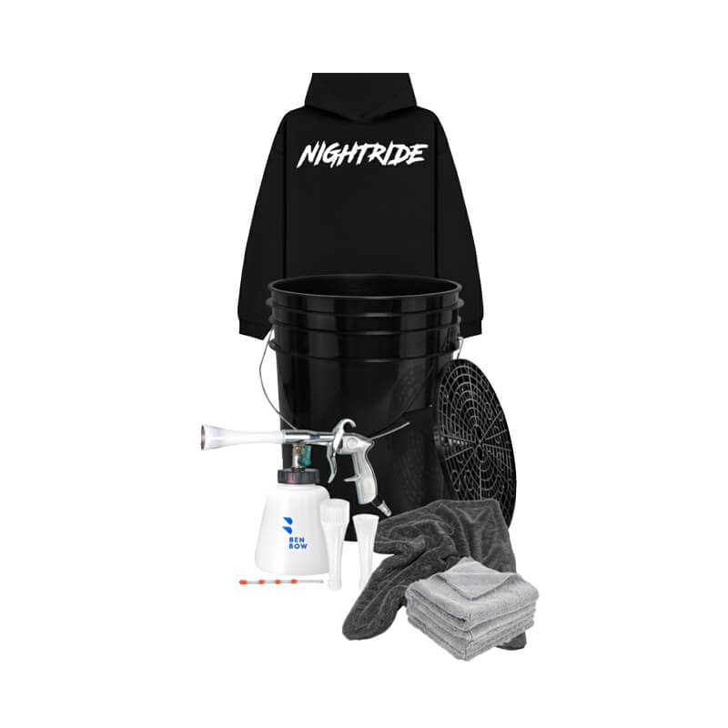 Zestaw został stworzony dla entuzjastów detailingu i fanów marki Nightride, którzy cenią zarówno wysoką jakość pielęgnacji samochodu, jak i wyróżniający się styl. Kluczowym elementem zestawu jest Premium bluza Nightride w wybranym rozmiarze, uzupełniona kompletem niezbędnych narzędzi, w tym pistoletem czyszczącym BenBow 234, kubłem detailingowym z separatorem oraz akcesoriami do osuszania. Jest to kompletny, gotowy prezent łączący praktyczność z lifestyle’em.