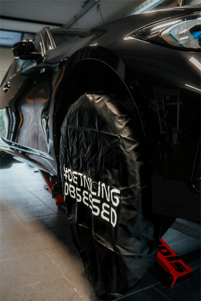 - Prace detailingowe: załóż pokrowiec na koło, aby uniknąć zabrudzenia opony chemią lub osiadania pyłu z past polerskich.