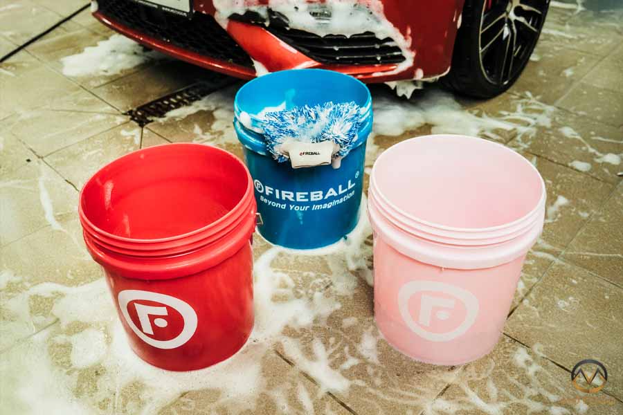 Do mycia właściwego przygotowujemy dwa wiadra z separatorami – jedno do wody z szamponem, drugie do płukania rękawicy. Warto wykorzystać tu wiadra FIREBALL, które sprawdzają się przy codziennym myciu i pomagają zachować porządek.