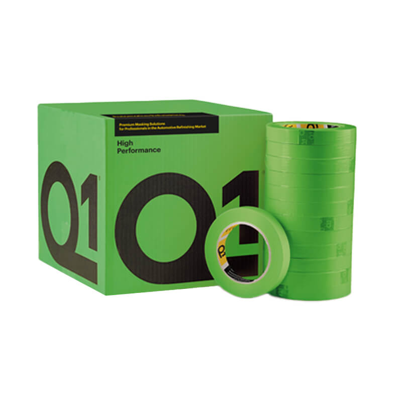 Taśma maskująca Q1 High Performance została zaprojektowana z myślą o najbardziej wymagających pracach lakierniczych i blacharskich. Zapewnia doskonałą odporność na wysokie temperatury – wytrzymuje do 110°C przez 30 minut – oraz na ekspozycję na promieniowanie UV do 3 dni. Zaawansowana formuła kleju na bazie rozpuszczalnika gwarantuje doskonałą przyczepność do różnych powierzchni, zapobiegając odrywaniu się taśmy oraz podciekaniu farby. Nośnik taśmy wykonany jest z papieru krepowego, który łatwo dopasowuje się do zakrzywionych i nieregularnych powierzchni. Dzięki specyficznemu wodoodpornemu zabezpieczeniu taśma cechuje się znakomitą odpornością na wilgoć oraz farby wodorozcieńczalne, co czyni ją idealną do aplikacji z użyciem mokrego szlifowania.