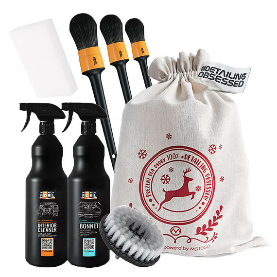 Zestaw kosmetyków i akcesoriów ADBL do kompleksowego wyczyszczenia wnętrza naszego samochodu. Używając kosmetyków wchodzących w skład zestawu wyczyścimy takie powierzchnie jak vinyl, plastik, gumę (Interior Cleaner) oraz podsufitkę, dywaniki i tapicerkę materiałową (Bonnet). Za pomocą znajdujących się w zestawie akcesoriów wyczyścimy również wszelkie detale, szczeliny, kratki nawiewów itp. Jednym słowem - w pełni zadbamy o każdy zakamarek wnętrza naszego samochodu! Cały zestaw ozdabia świąteczny lniany worek MOTOGO/Detailing Obsessed nadający całości świątecznego charakteru w związku ze zbliżającymi się wielkimi krokami Świętami Bożego Narodzenia!